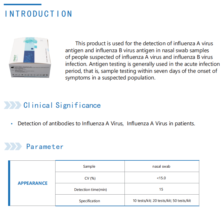 This product is used for the detection of influenza A virus antigen and influenza B virus antigen in nasal swab samples of people suspected of influenza A virus and influenza B virus infection. Antigen testing is generally used in the acute infection period,that is,sample testing within seven days of the onset of symptoms in a suspected population.